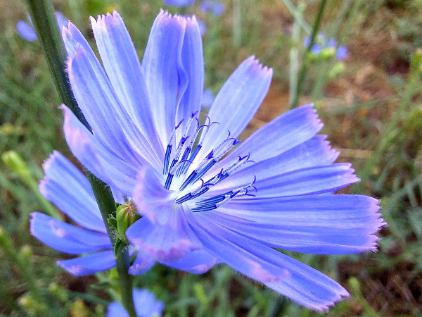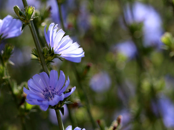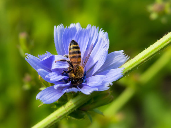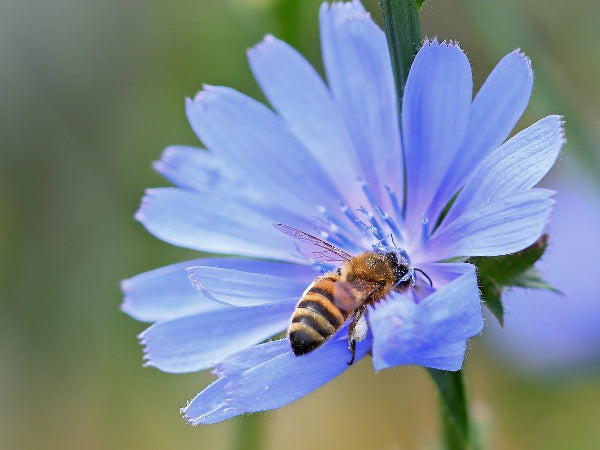 Die Wegwarte (lat. Cichorium intybus) - eine besonders bei Bienen beliebte Pflanze mit leuchtend blauen Blüten.